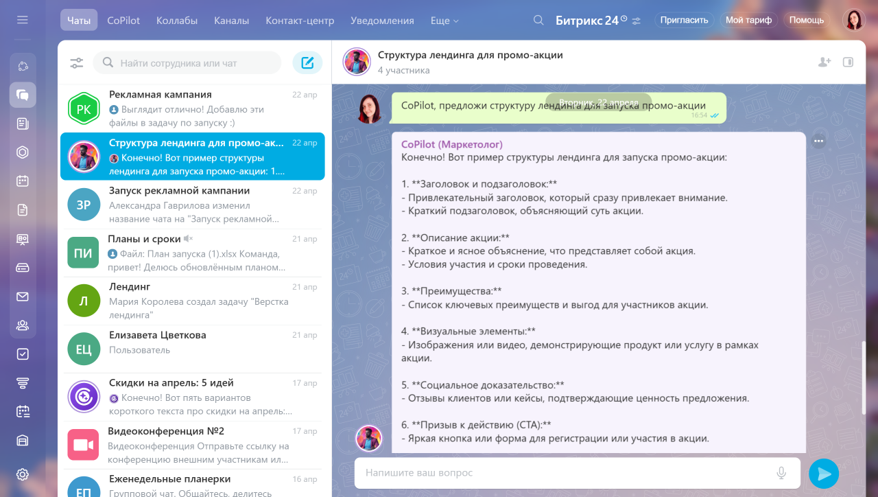 Например, вы обсуждаете с командой запуск нового продукта. BitrixGPT поможет сформулировать цель, составить план и подготовить структуру лендинга.